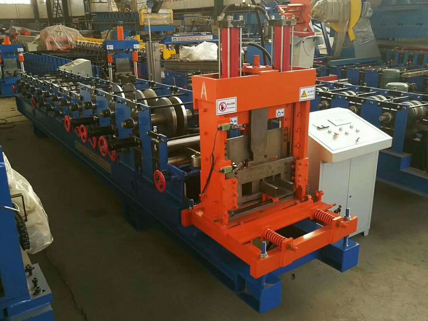 13.成型部分:辊压成型系统由机架、传动部件及冷弯成型辊轮组等组成.分为式车轮旋转成型,成型效果好,减少轮子和原材料之间的摩擦力,调试方便、.